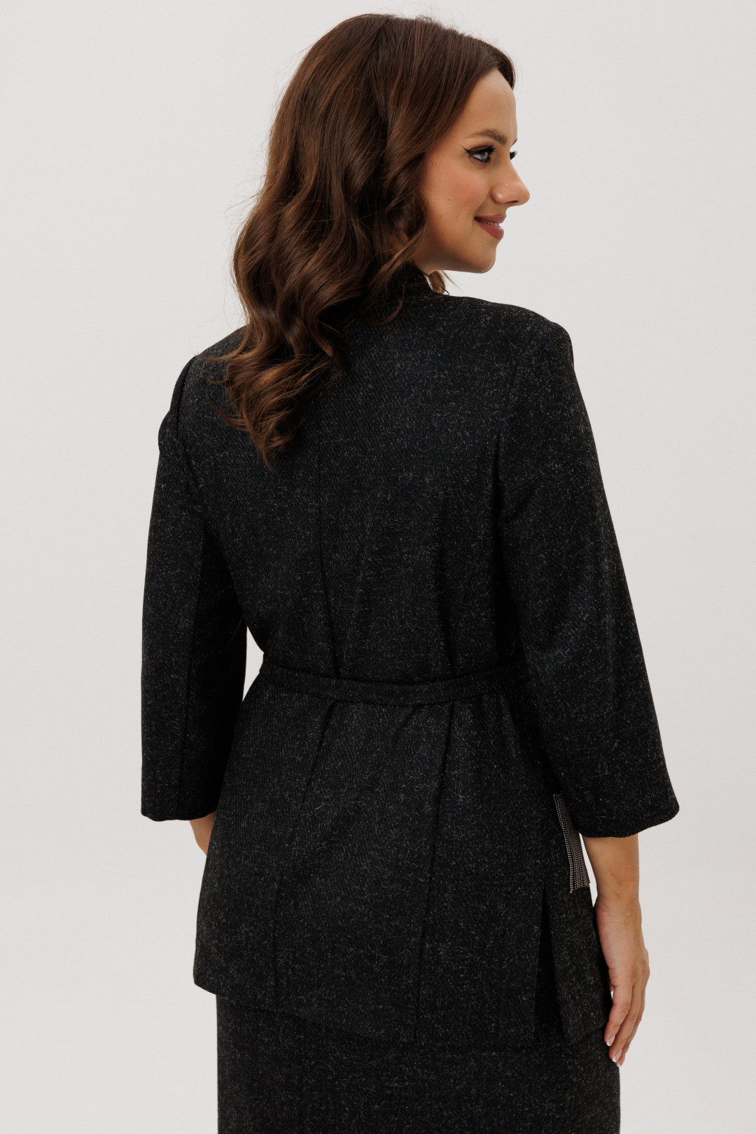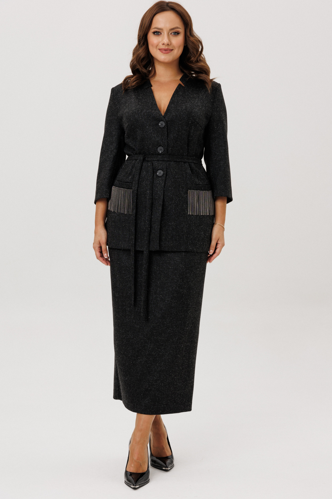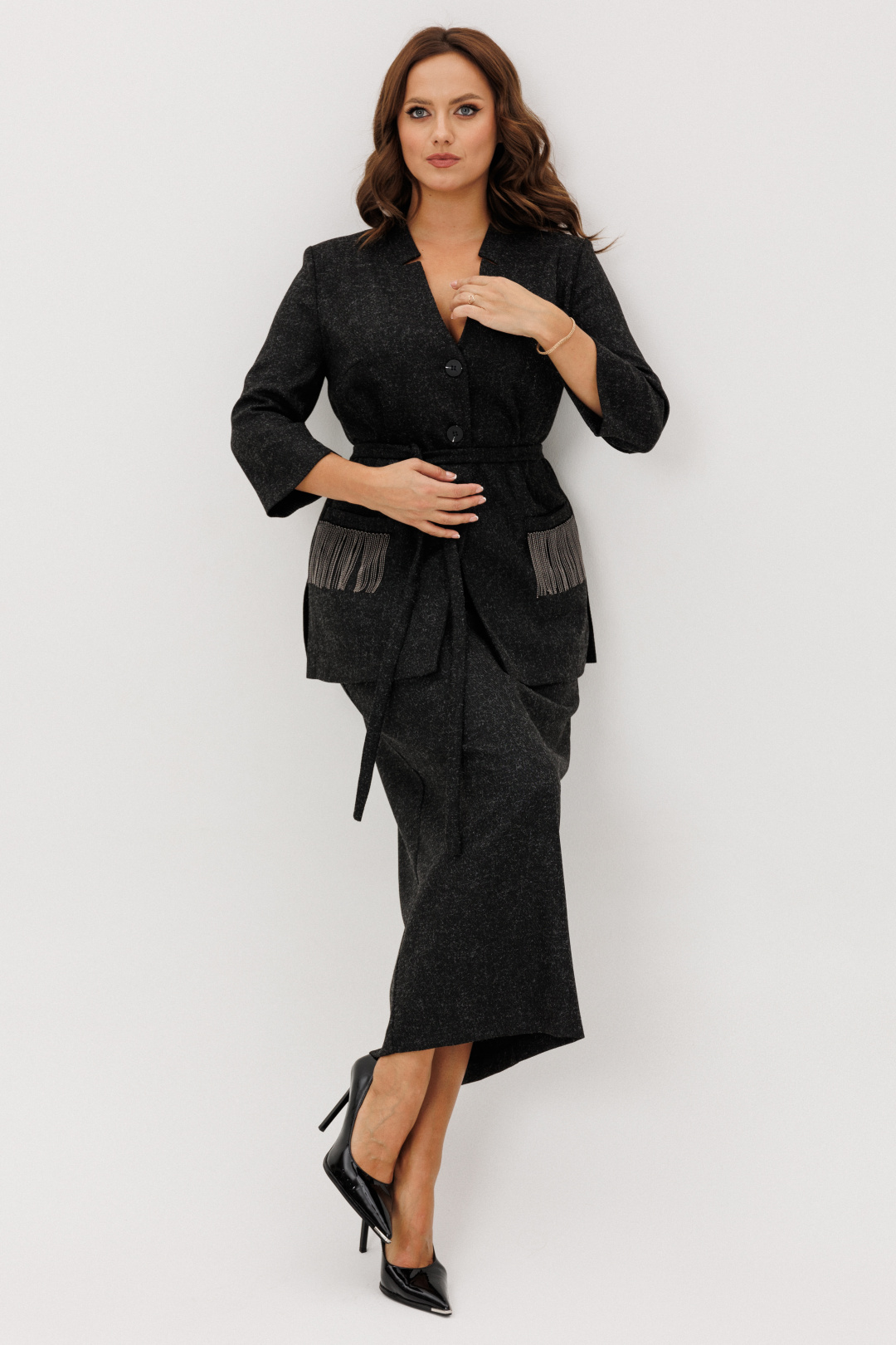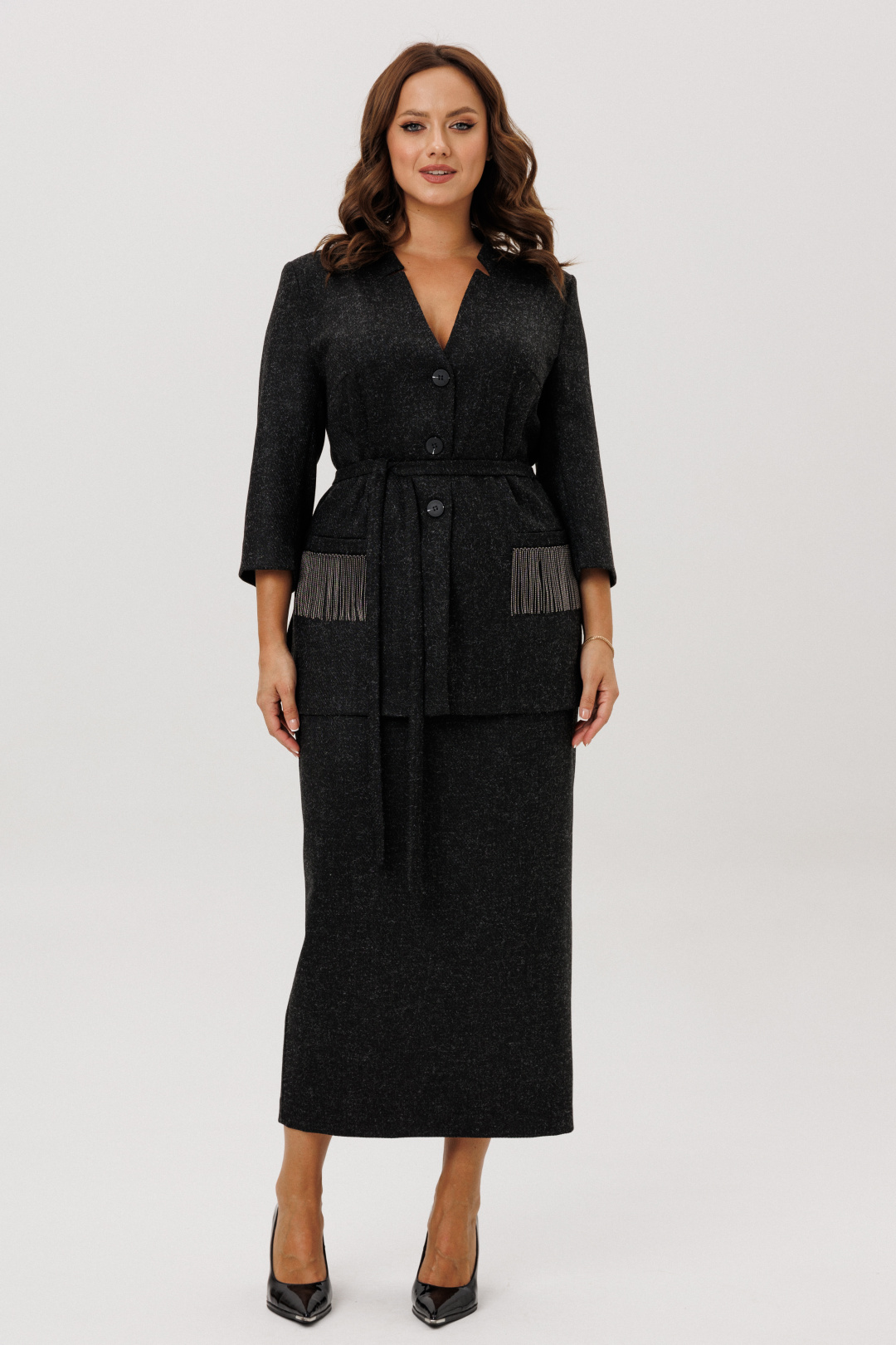 Комплект женский в классическом стиле с юбкой миди. Изготовленный из однотонной ткани с декоративным ворсом, создающим эффект меланжа. Жакет удлиненный прямого силуэта без подкладки. По переду застежка на петли и пуговицы, нагрудные вытачки от рельефа, функциональные карманы листочка с декоративной бахромой. По спинке средний шов и вертикальные рельефы из проймы. В боковых швах разрезы. Рукав втачной двухшовный с небольшим разрезом в переднем шве. По горловине воротник стойка. Юбка миди на поясе с резинкой по бокам, на подкладке. По переднему полотнищу талиевые вытачки, по заднему полотнищу средний шов с застежкой на потайную молнию и разрезом внизу. В комплекте сьемный мягкий пояс из основной ткани. Длина жакета по спинке 71 см.