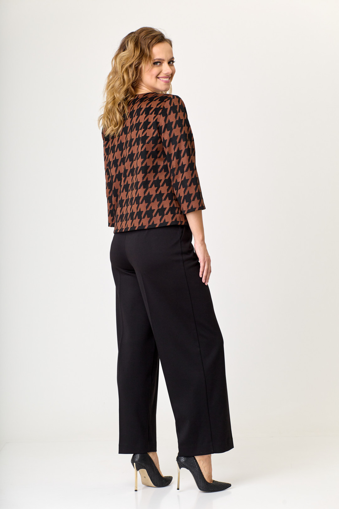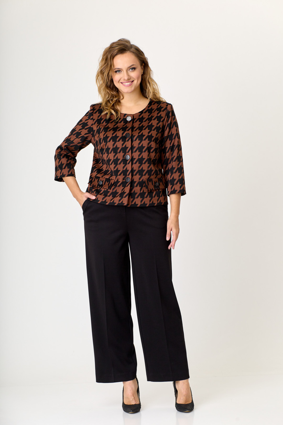 Комплект состоит из укороченного жакета и брюк. Деловой жакет на подкладке ,застежка на планки и декоративные пуговицы. Брюки прямого силуэта с карманами в боковых швах. Идеальная модель для офиса и деловых встреч.