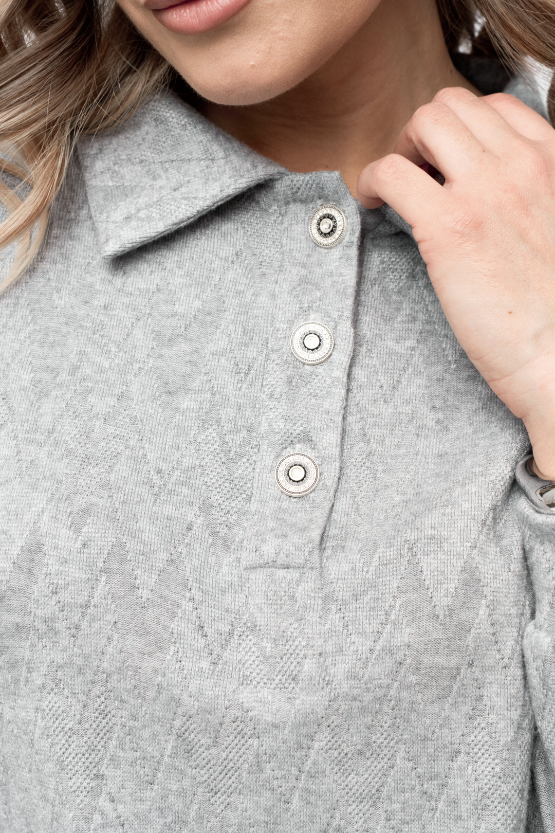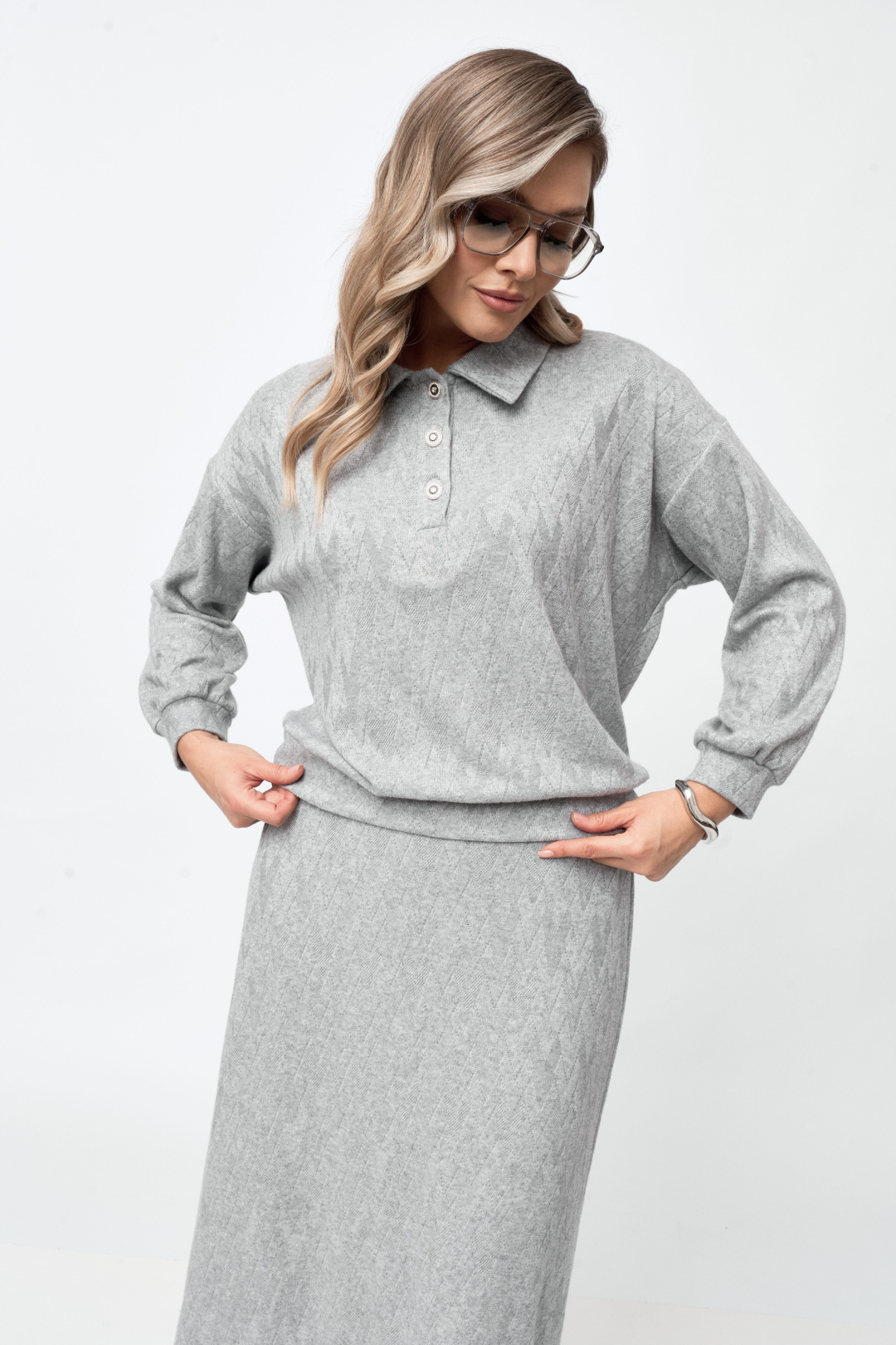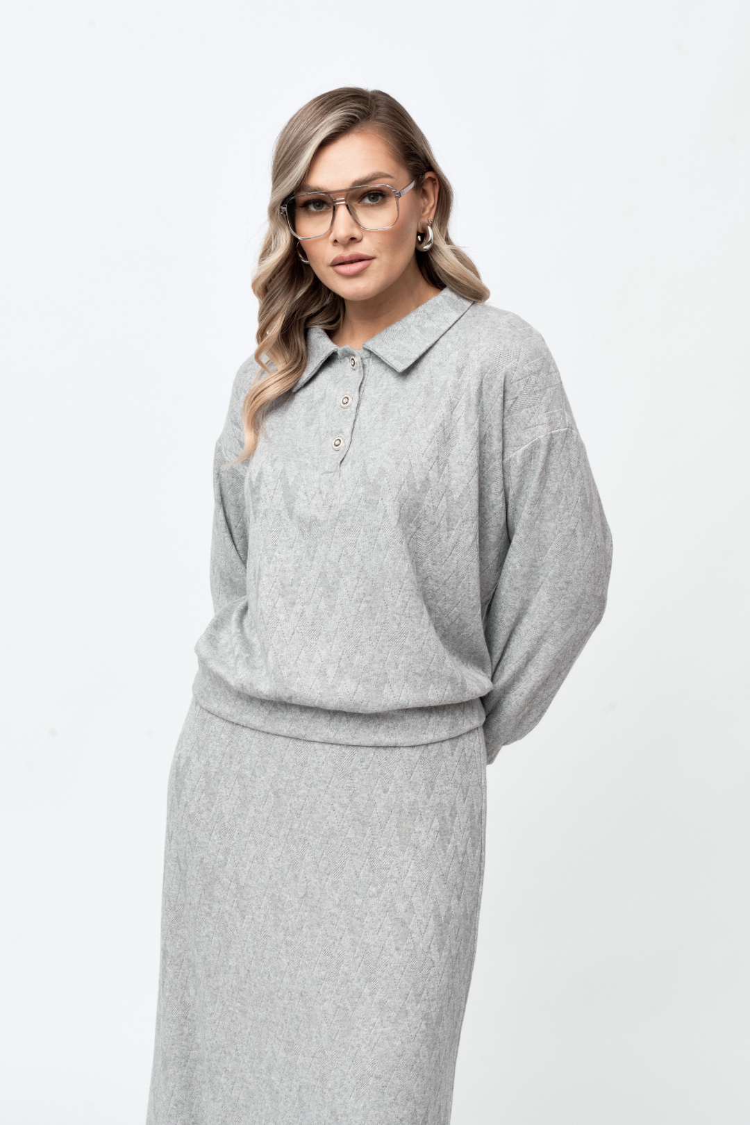 Блуза-поло свободного силуэта, со спущенным длинным рукавом на манжете. Горловина с воротником и застежкой на петли пуговицы. По низу блузы есть планка из основной ткани.