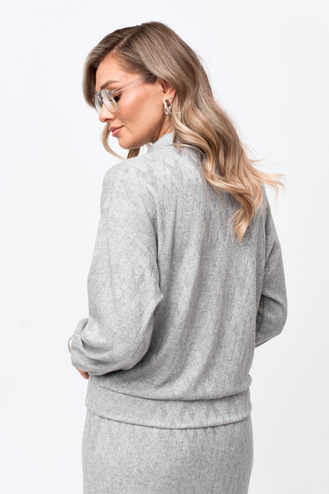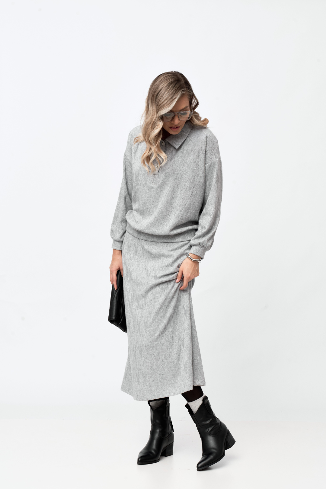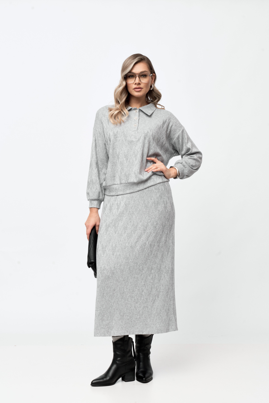Блуза-поло свободного силуэта, со спущенным длинным рукавом на манжете. Горловина с воротником и застежкой на петли пуговицы. По низу блузы есть планка из основной ткани.