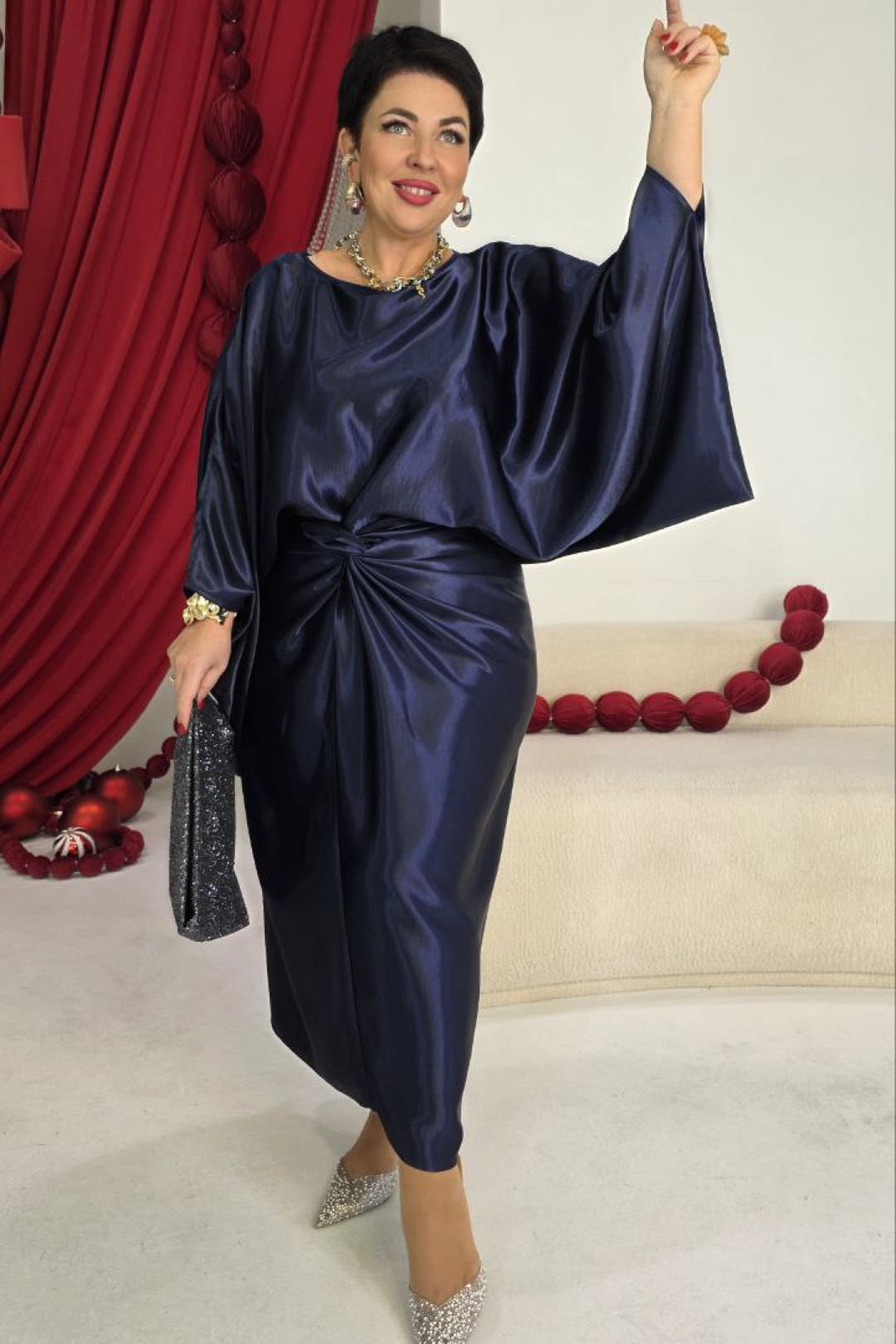 Общий образ — союз современных линий и благородного сияния. Контраст между строгой геометрией прямоугольной блузы и плавной свободой рукавов, и между богатым блеском ткани создаёт костюм, который подходит для торжественных мероприятий и вечерних встреч, сохраняя при этом эффект лёгкой воздушности и неповторимой эстетики. Это наряд, в котором каждый штрих продуман до мельчайших деталей, чтобы подчеркивать женственность и уверенность в любом световом окружении. Грациозный костюм встречает восходящую элегантность — блуза прямоугольного силуэта с рукавом кимоно и юбка миди, завязывающаяся впереди узлом, выполнены в стильном перламутровом оттенке. Блуза держится по линии плеча строго и уверенно, но её рукав-кимоно добавляет свободную плавность движению и нежную асимметрию. Головина по форме «лодочка», линия плеча спущенная. Фасон прямоугольной блузы подчеркивает минимализм, который обретает характер за счёт текстуры и сияния. Рукав-кимоно свободен в движении, но его концы и края тщательно обработаны, образуя спокойную, но выразительную линию по всей длине руки. Юбка миди завершает композицию: она облегает талию и плавно расходится к низу, не теряя движения. Завязка спереди образует аккуратный узел, который служит ярким акцентом и одновременно функциональной деталью, позволяющей регулировать посадку. Лаконичная посадка сочетается с мягким мерцанием ткани — переливы ткани, будто собрались в узоре мелких светлячков, танцующих на поверхности материала.В оригинальности образу помогает отсутствие лишних деталей — всё в этом костюме рождает ощущение продуманной сдержанности.
