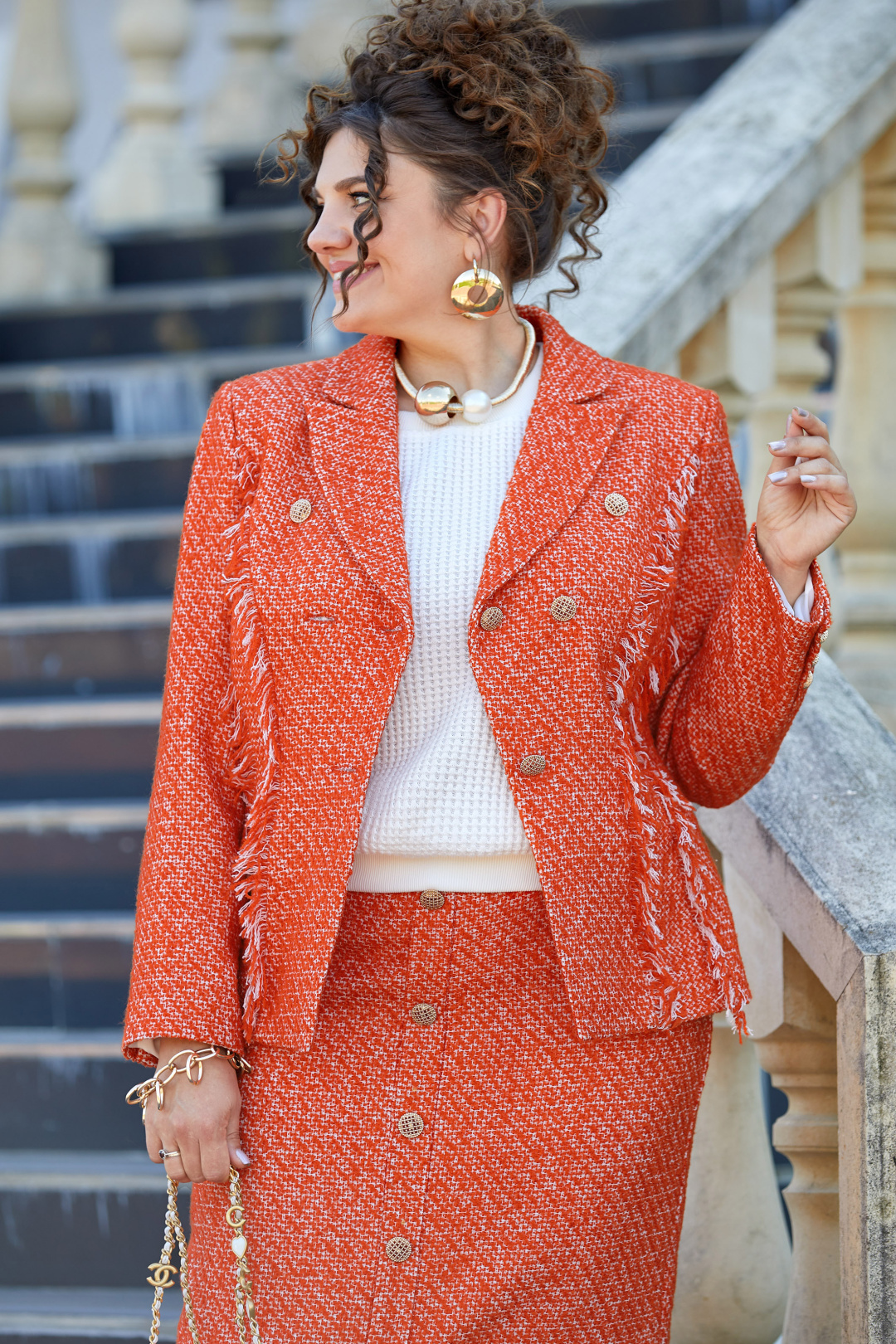 Жакет полуприлегающего силуэта на подкладке, с двубортной застёжкой на петли пуговицы по краю борта. Воротник пиджачного типа с лацканами. По переду жакета рельефы со вставками декоративной бахромы из основной ткани. Спинка с средним швом и декоративными рельефами. Рукав втачной, длинный, двухшовный.