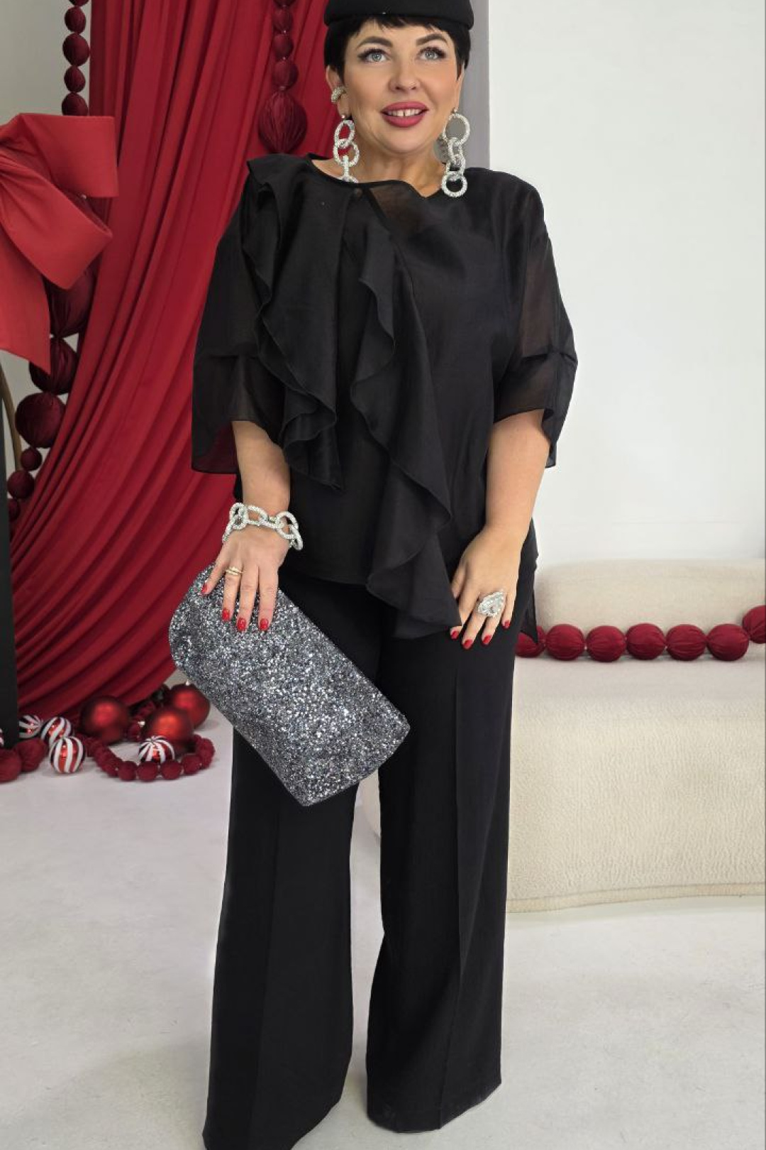 Комплект женский брючный, состоящий из верхней блузы, нижней блузы и брюк. Вуалирующая прозрачность блузы, скрывает несовершенства фигуры, и создает идеальный силуэт, а брюки из ткани с «жатой» фактурой стройнят и вытягивают силуэт. Верхняя блуза свободного силуэта с округлой формой горловины. Линия плеча спущенная. Рукав втачной, длинной ¾ с декоративным защипом. Спинка без особенностей. Низ в блузе ассиметричный с разрезами в боковых швах. Главным акцентом блузы являются отделочные вставки в подрезе в виде рюш. Нижняя блуза свободного силуэта, с округлой формой горловины, нагрудными вытачками по переду блузы. Спинка без особенностей. В боковых швах разрезы. Брюки прямого силуэта со стрелками по переду. Пояс в брюках притачной с эластичной тесьмой-резинкой, которая обеспечивает максимально удобную посадку на любой тип фигуры. Длина верхней блузы по спинке спинки 69,5 см (р 50-54), 70 см (р 56-60), длина рукава 29 см (р 50-54), 30 см (р 56-60). Длина нижней блузы 61 см (р 50-54), 61,5 см (р 56-60), длина рукава (плеча) 6,5 см (р 50-54), 7 см (р 56-60). Длина брюк по боковому шву от шва притачивания пояса 108 см.
