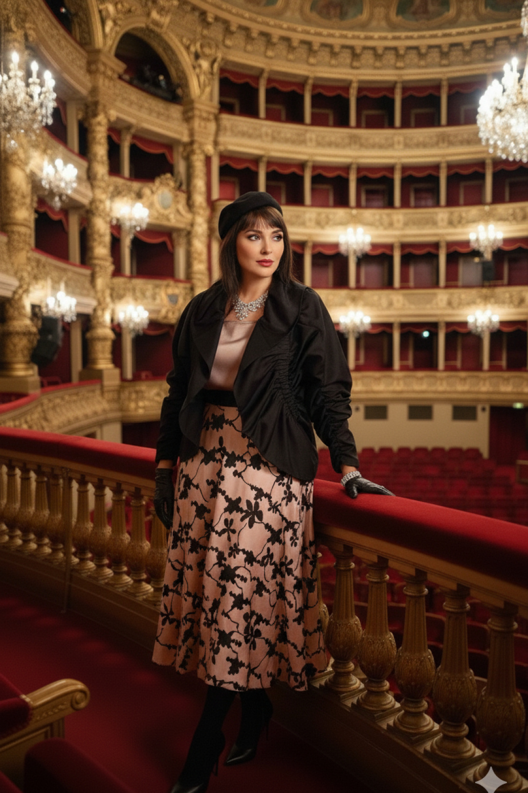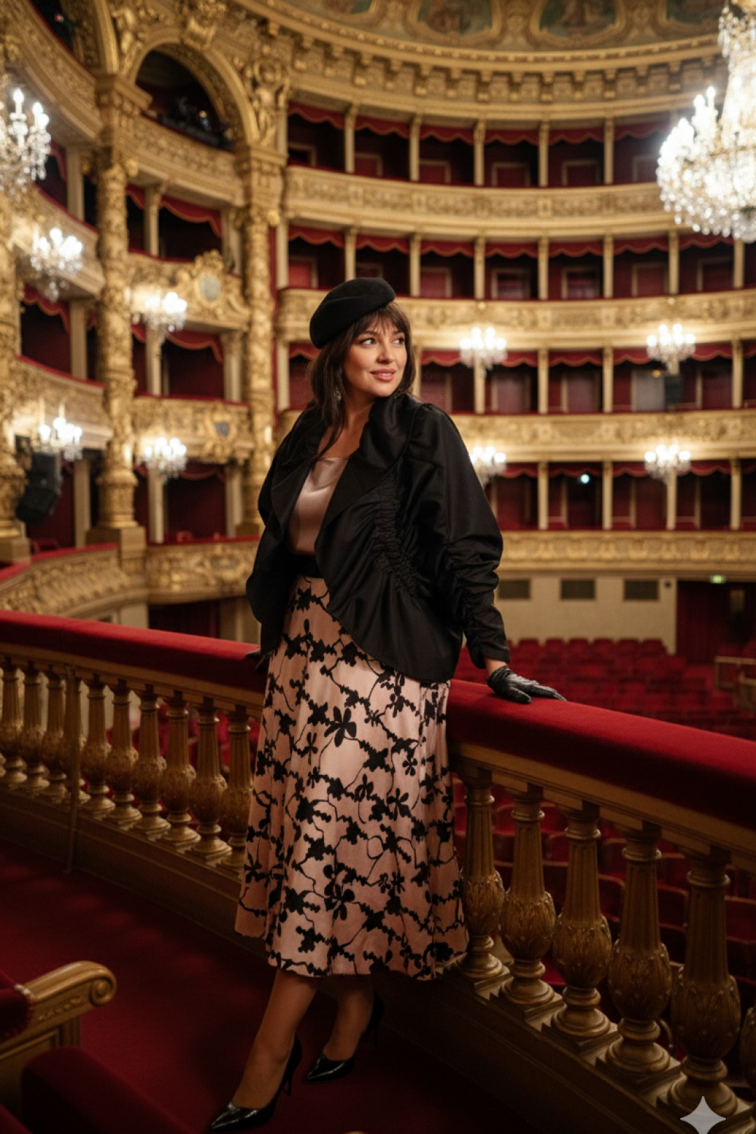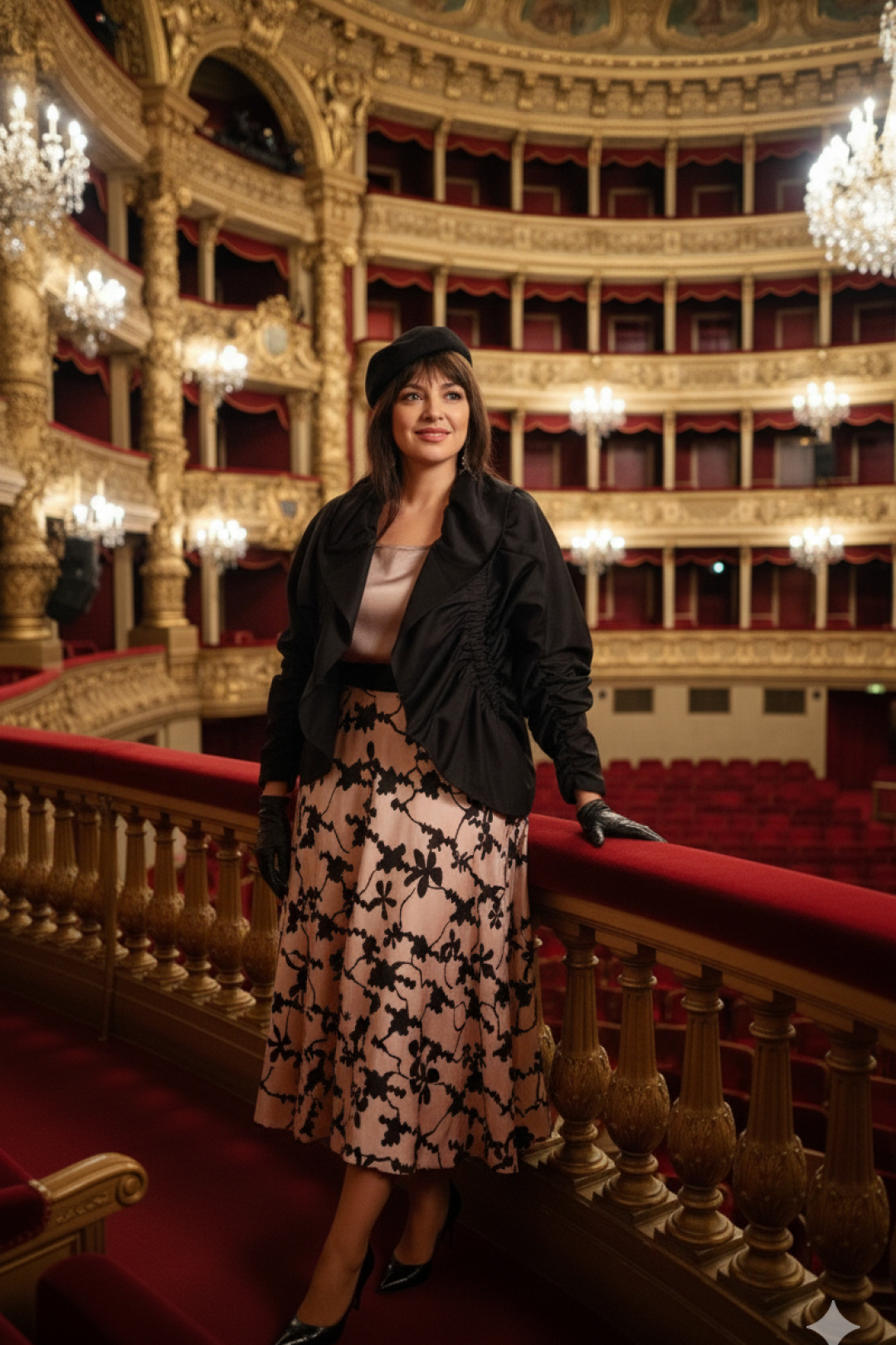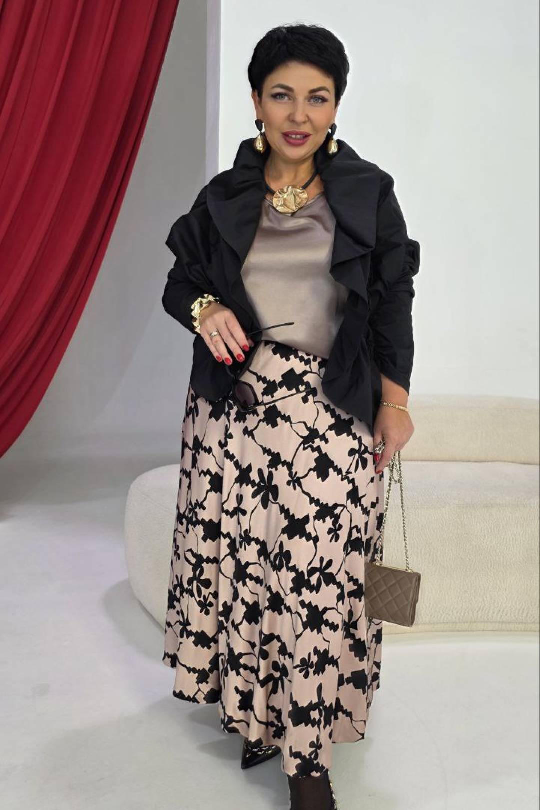 Женский комплект состоит из трёх элементов, каждый из которых дополняет другой, создавая гармоничную и современную образность. Жакет - «оверсайз» силуэта, выглядит свободной на силуэте, её пространство вокруг плеч и линии талии напоминает мягкую волну одежды, которая свободно дышит и передаёт непринуждённую уверенность. Декоративные резинки с эффектом сборки вдоль рукавов, по деталям переда добавляют игривую динамику. Он будто приглушённый акцент в ансамбле — она подчёркивает силуэт сверху без утяжеления, оставляя место для свободной игры ткани. Блуза в нежном бежевом оттенке, который гармонично сочетается с насыщенным чёрным цветом комплекта. Блуза прямого силуэта с округлой формой горловины и нагрудными вытачками по полочке. Спинка без особенностей. Низ в блузе фигурной формы.Юбка баллон из ткани с принтом, конической формы, расширяется к низу. Пояс в юбке притачной в виде декоративной эластичной тесьмы-резинки, а боковом шве застёжка на потайную тесьму-молнию. Юбка на подкладке. Длина спинки жакета 61 см, длина рукава 33 см. Длина блузки по спинке 63,5 см (р 48-52), 64 см (р 54-58), ширина плеча 8 см. Длина юбки 88 см (р 48-52), 89 см (р 54-58)