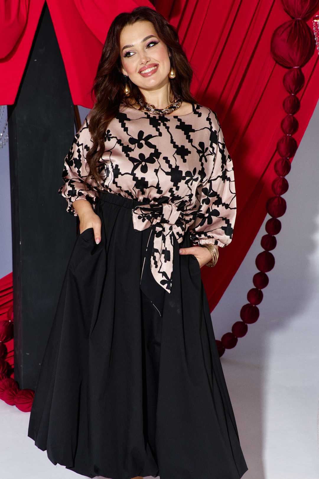 Невероятно красивое и элегантное платье отвечает всем требованиям вечернего наряда! Сочетание тканей разных фактур и дизайнов в одной модели - тренд сезона. Для лифа с мягкими присборенными рукавами мы выбрали пластичный атлас, а формоустойчивую тафту - для создания модной юбки «баллон». Сдержанный блеск атласа с деликатным принтом подчеркивает глубину тона черной тафты. Платье отрезное по талии, с круглой горловиной. Рукав длиной 7/8 со спущенной проймой и сборкой по низу на резинку. Длинная юбка «баллон» собирается по талии на эластичную ленту в отрезном поясе. По поясу платье декорировано бантом в виде съемной броши. Длина платья 129 см (р 48-52), 130 см (р 54-58). Длина рукава 31 см.