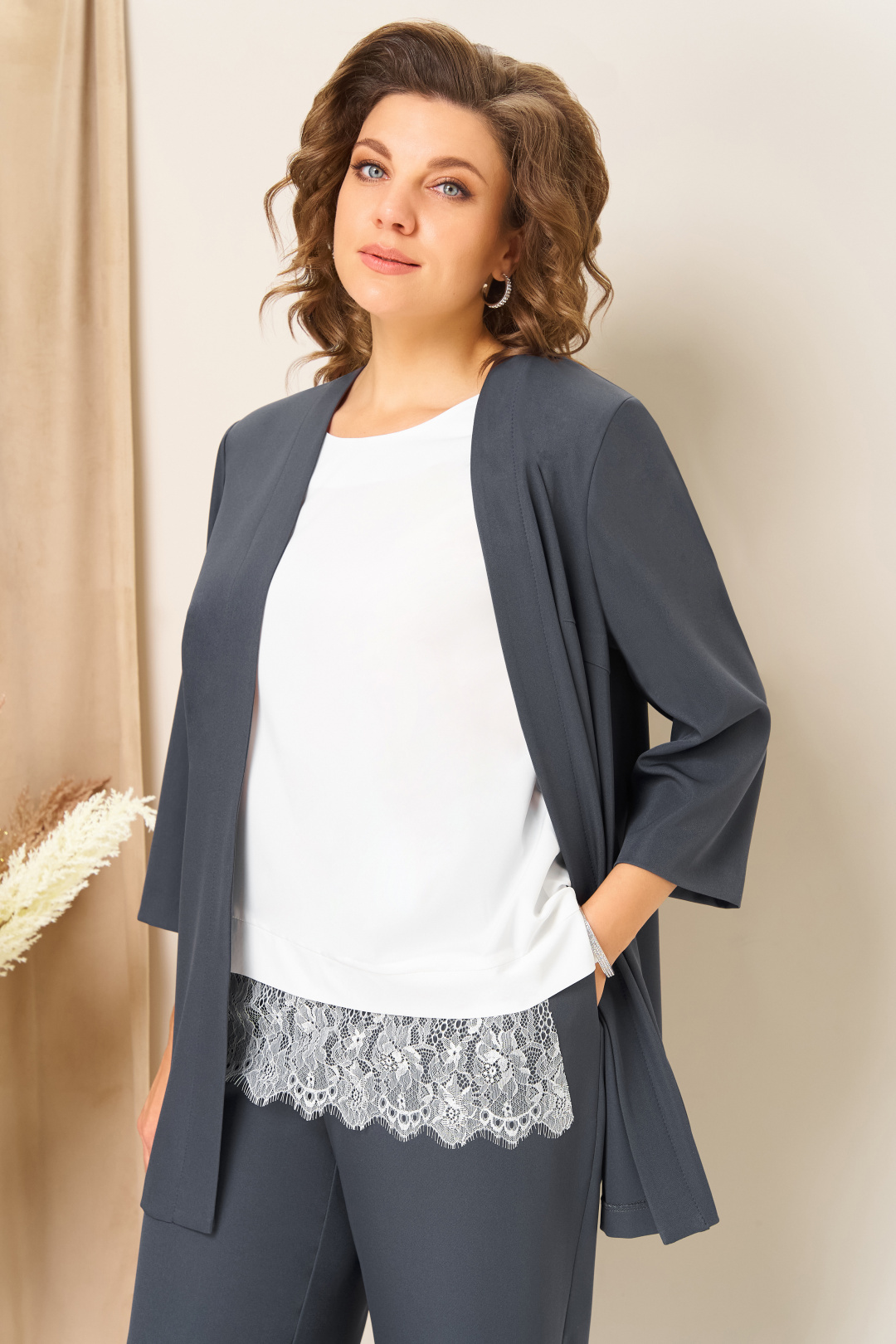 Изящный комплект-тройка: легкий жакет без подкладки и застежки, нарядная блуза с ассиметричным низом , а также брюки свободного кроя с карманами. Центральный элемент образа- красивое кружево по низу воздушной белой блузы.. Длина жакета по спинке-74см. Длина рукава- 50 см Брюки прямые с высокой посадкой и притачным поясом со вставками с резинкой. Длина брюк по боковому шву- 102см..Длина блузы по центру спинки- 64см. В комплекте изделия- элегантный узкий пояс из текстиля.