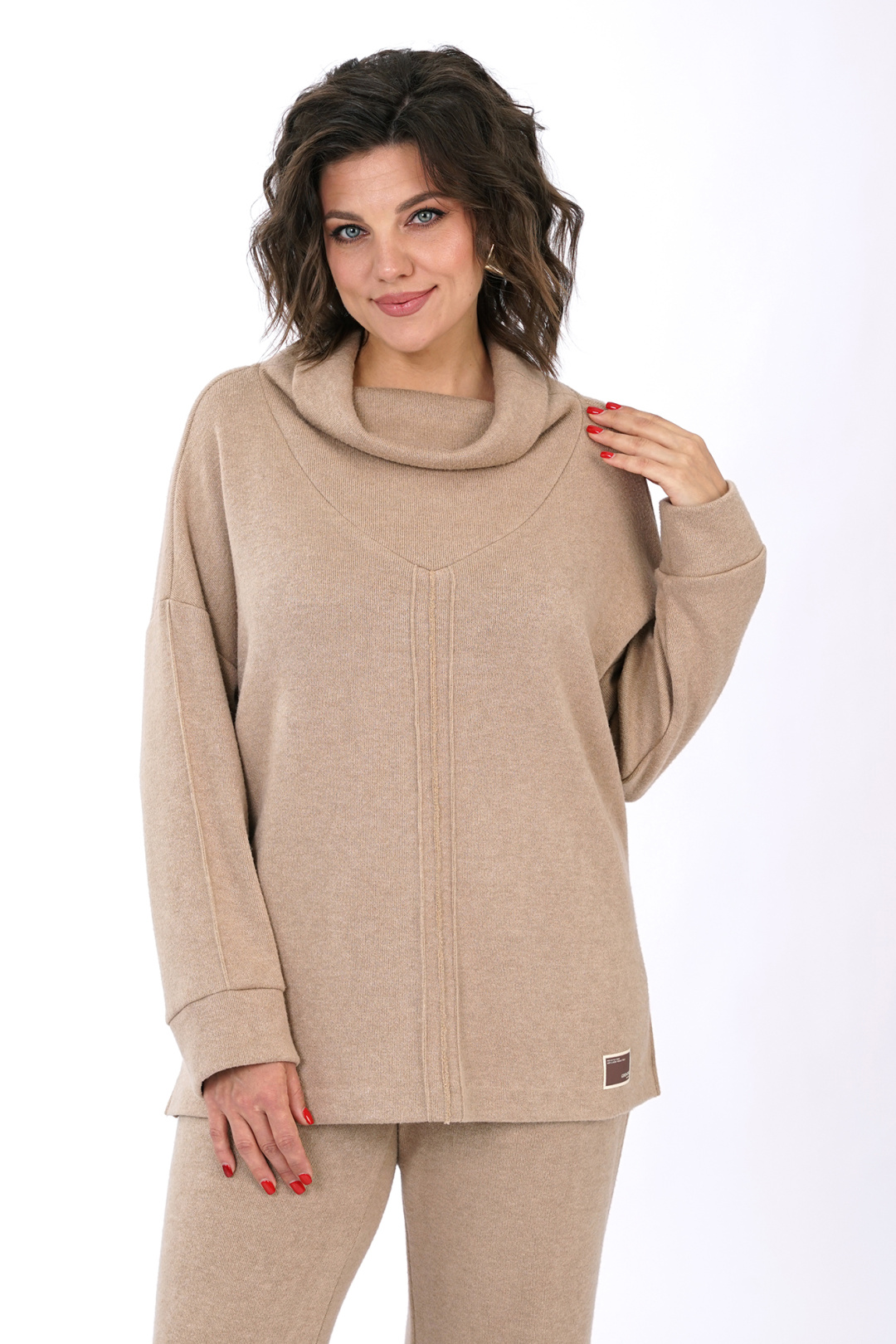 Блузон прямого, свободного силуэта, со спущенной линией плеча, с разноуровневым низом, с разрезами по боковым. Перед, рукава с декоративными защипами. Рукава втачные, одношовные, длинные понизу с притачными манжетами. Горловина фигурной формы с притачным воротником по форме «хамут».