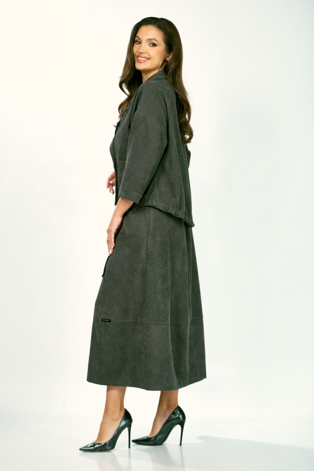 Жакет прямого силуэта со спущенной линией плеча и рубашечным рукавом добавляет характер. На полочке расположен вертикальный рельеф от линии плеча и настрочен накладной карман. Низ жакета обработан тройной обтачкой на которой расположена петля и протянут шнур. Низ рукава с притачной манжетой. Воротник пиджачного типа. Застежка двухбортная на петли и пуговицы. Юбка А-силуэта сверху на притачном поясе, по бокам с резинкой, создает стройный силуэт. На переднем полотнище юбки обработаны карманы с отрезным бочком, по низу-отрезная деталь,завершающая образ. Костюм декорирован нашивками в тон оновной ткани. Его приятно надеть и на работу и на прогулку с друзьями. Декор и фурнитура могут отличаться от представленных на фото.