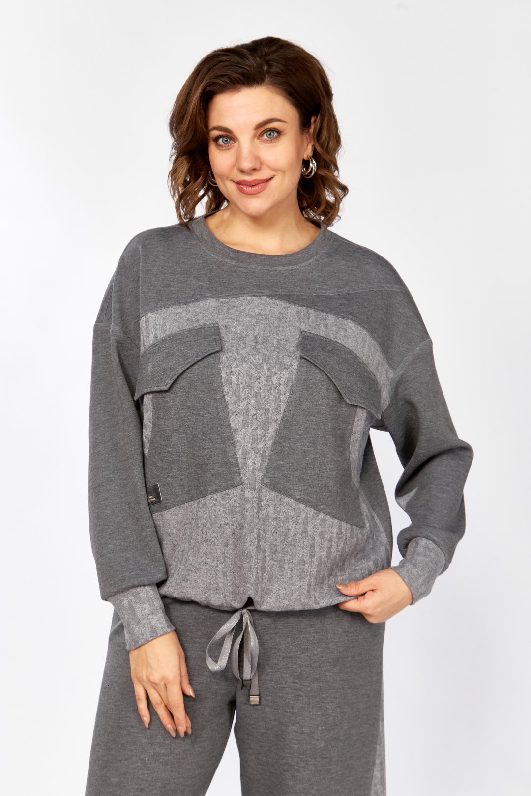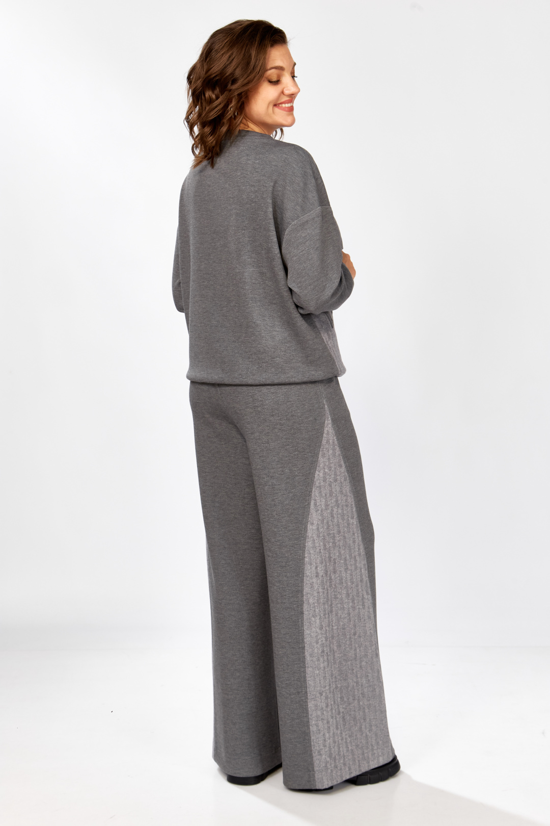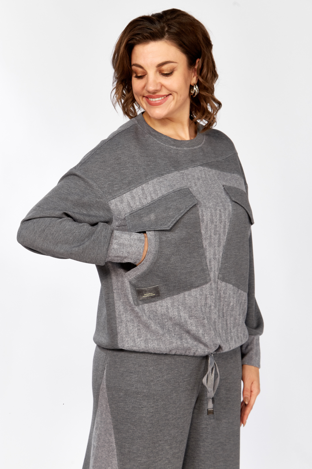Трикотажный костюм в серых тонах. Этот комплект идеально сочетает комфорт и современный стиль. Верх - это джемпер с длинными рукавами, выполненный из текстурированного трикотажа с удобными карманами на груди и контрастной вставкой, придающий образу глубину. Брюки свободного кроя с широкими штанинами, пояс на резинке. Боковые панели брюк повторяют структуру верха, создавая гармоничный и цельный образ. Идеально подходит для прогулок, путешествий и стильного отдыха дома. Длина рукава 49см., ширина плеча 22,5см., длина брюк 104,5см. Декор может отличаться от представленного на фото.